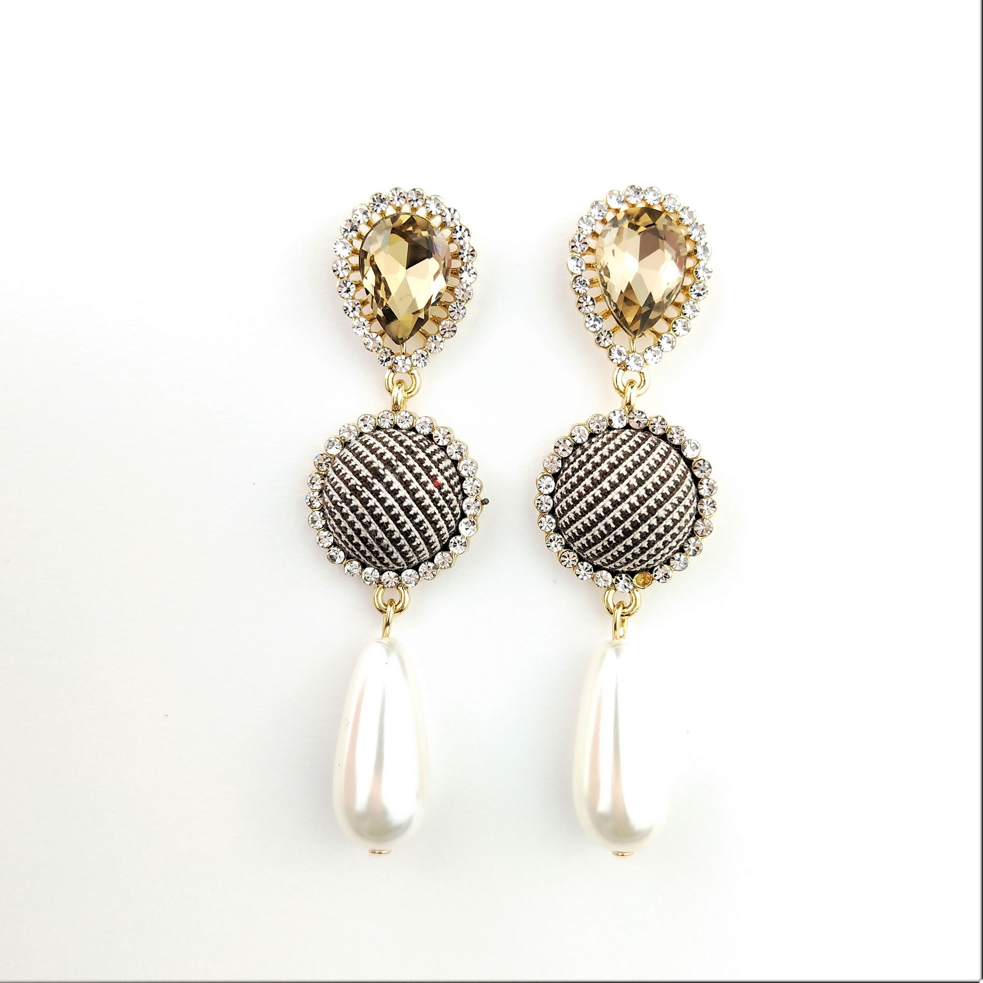 ◤KOREA◢ 水鑽格子珍珠水滴耳環