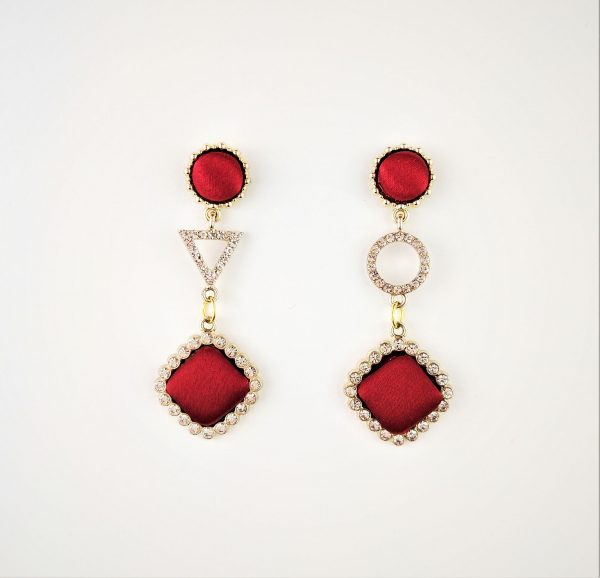 金邊方形紅色布面水滴水鑽耳環(兩色)